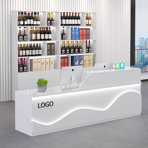 화이트 MDF 소매 체크 아웃 카운터 부티크 상점 및 슈퍼마켓 판매 등록 현금 데스크 등록을위한 나무 리셉션 데스크